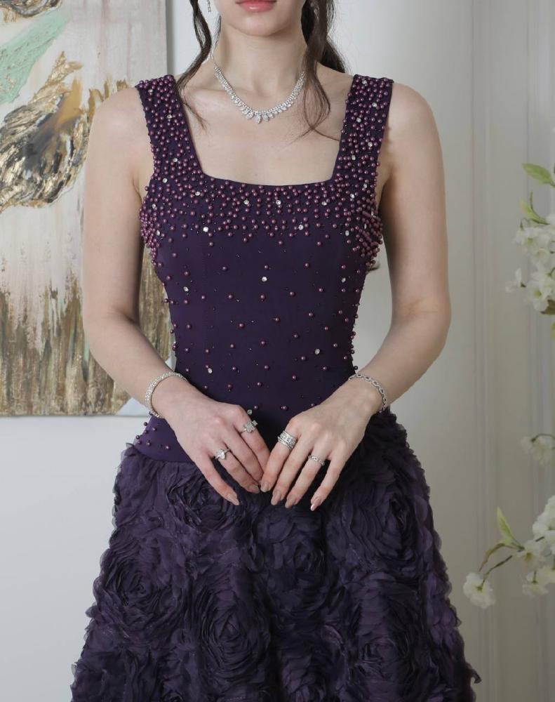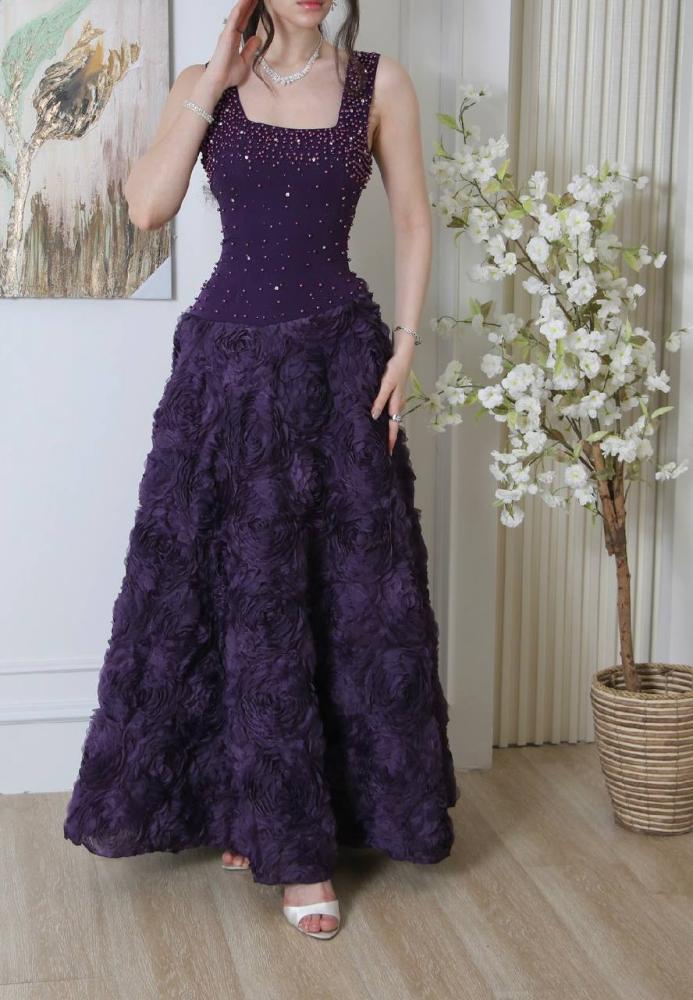 فستان أنيق بلون بنفسجي ملكي، بتصميم فاخر يجمع بين التطريز الناعم على الصدر وقماش الورود البارزة في التنورة. خامته فخمة تعطي لمسة راقية وجاذبية أنثوية