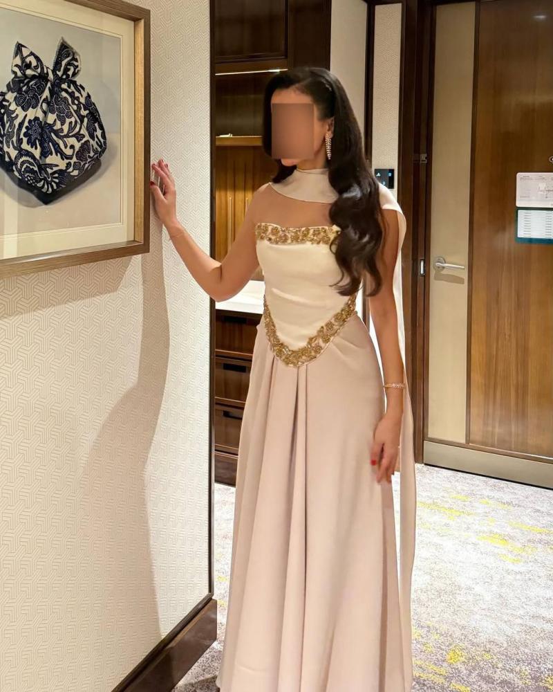 فستان سهرة فاخر بقصة ملكية أنيقة. يجمع بين اللون العاجي (أو السكري) للجزء العلوي، ودرجة البيج الفاتح الهادئ للتنورة، مع تفاصيل ذهبية بارزة.