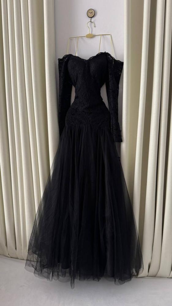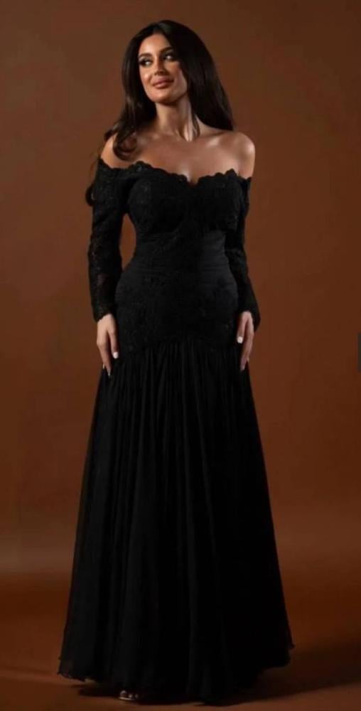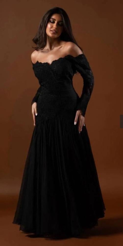 فستان سهرة أسود طويل وفخم، يتميز بقصة ضيقة عند الخصر ثم تتسع نحو الأسفل، مع ذيل طويل وشفاف ينسدل خلفه. القماش مطرز أو مشكوك يدوياً بالخرز أو الترتر اللامع على الصدر والأكمام، مما يمنحه مظهراً في غاية الأناقة والفخامة.