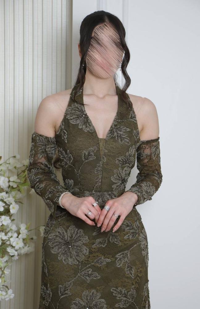 إطلالة ملكية فريدة تجمع بين الجرأة والرقي في اللون الأخضر الزيتوني.