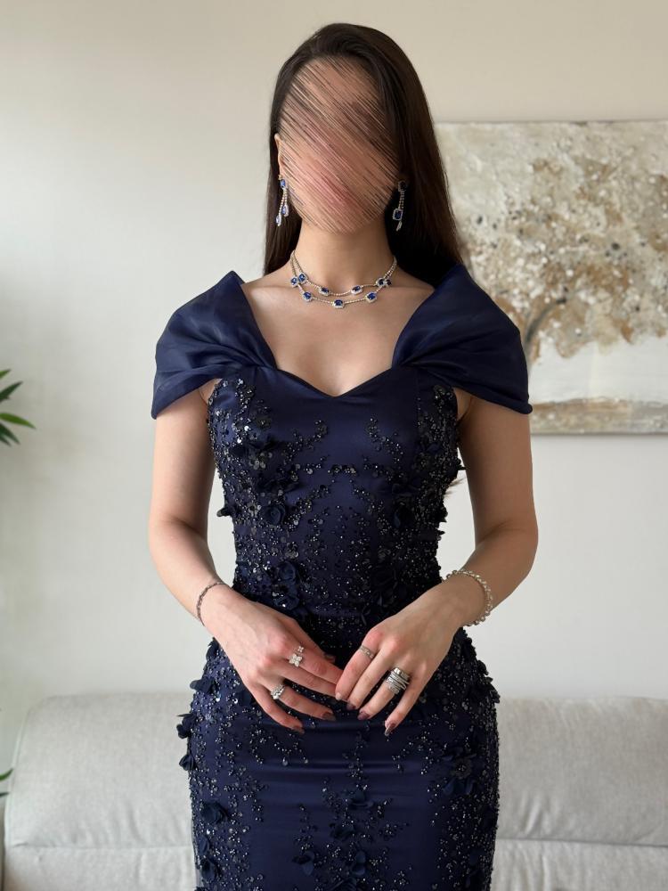 فستان سهرة كحلي ملكي بتفاصيل تطريز يدوي فاخرة وزخارف ثلاثية الأبعاد من الورود، مصنوع من قماش ساتان ناعم لامع، مع كتفين منسدلين تضفي لمسة أنوثة وأناقة راقية