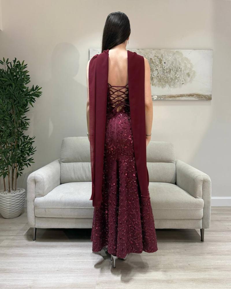 فستان سهرة طويل عنابي/خمري مطرز بالكامل، ب وضيق يبرز الجسم. يتميز بظهر مفتوح مع رباط متقاطع (كورسيه) ووشاح طويل منسدل.