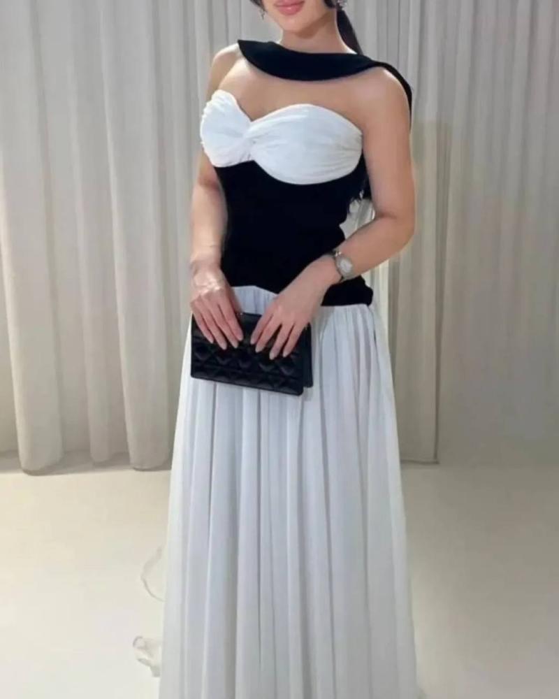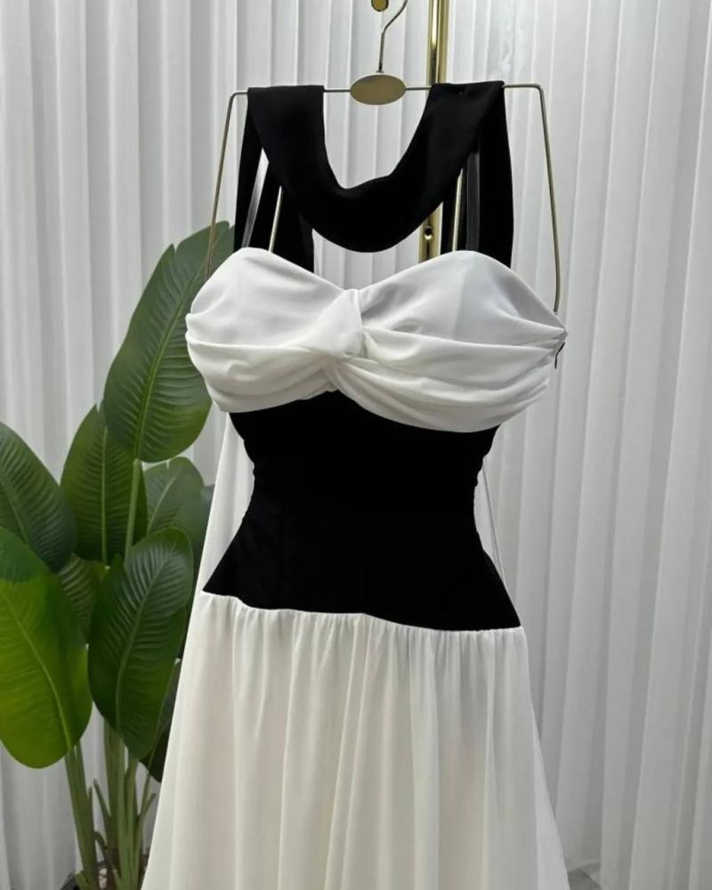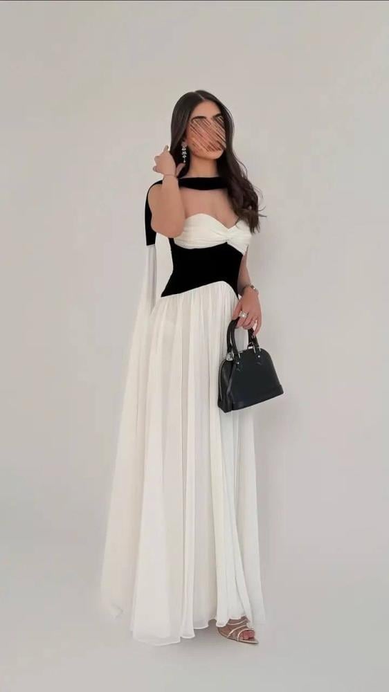 فستان سهرة ماكسي أنيق بتباين الأبيض والأسود. يتميز بـ صدرية مخملية سوداء بقصة قلب، وتنورة واسعة من الشيفون الأبيض الانسيابي