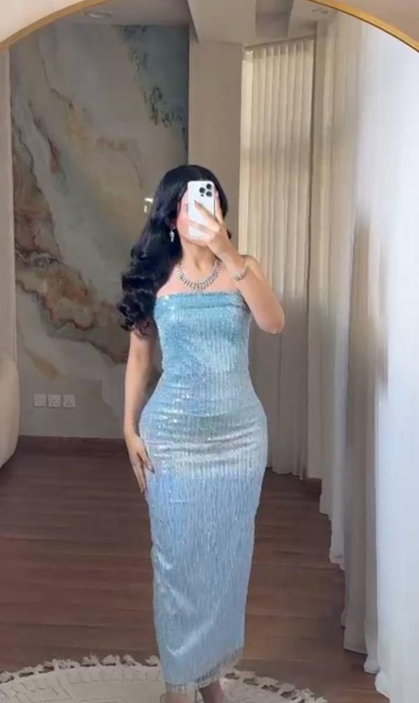 "تألقي ببريق ساحر ومختلف مع فستان السهرة هذا، بلون الأزرق الفاتح الباستيلي (السماوي). إطلالة مثالية لمن تبحث عن النعومة واللمعان.